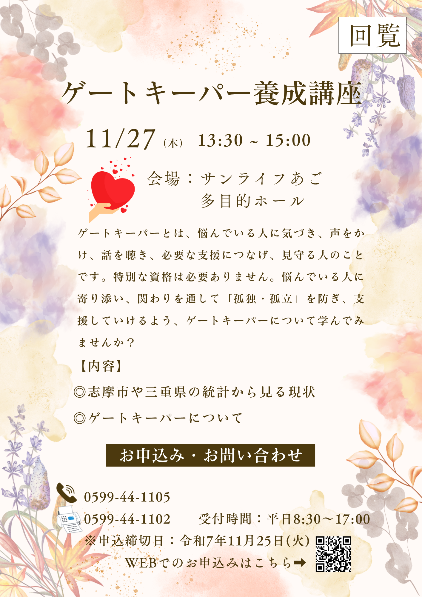 ゲートキーパーとは、悩んでいる人に気づき、声をかけ、話を聴き、必要な支援につなげ、見守る人のことです。特別な資格は必要ありません。悩んでいる人に寄り添い、関わりを通して「孤独・孤立」を防ぎ、支援していけるよう、ゲートキーパーについて学んでみませんか?