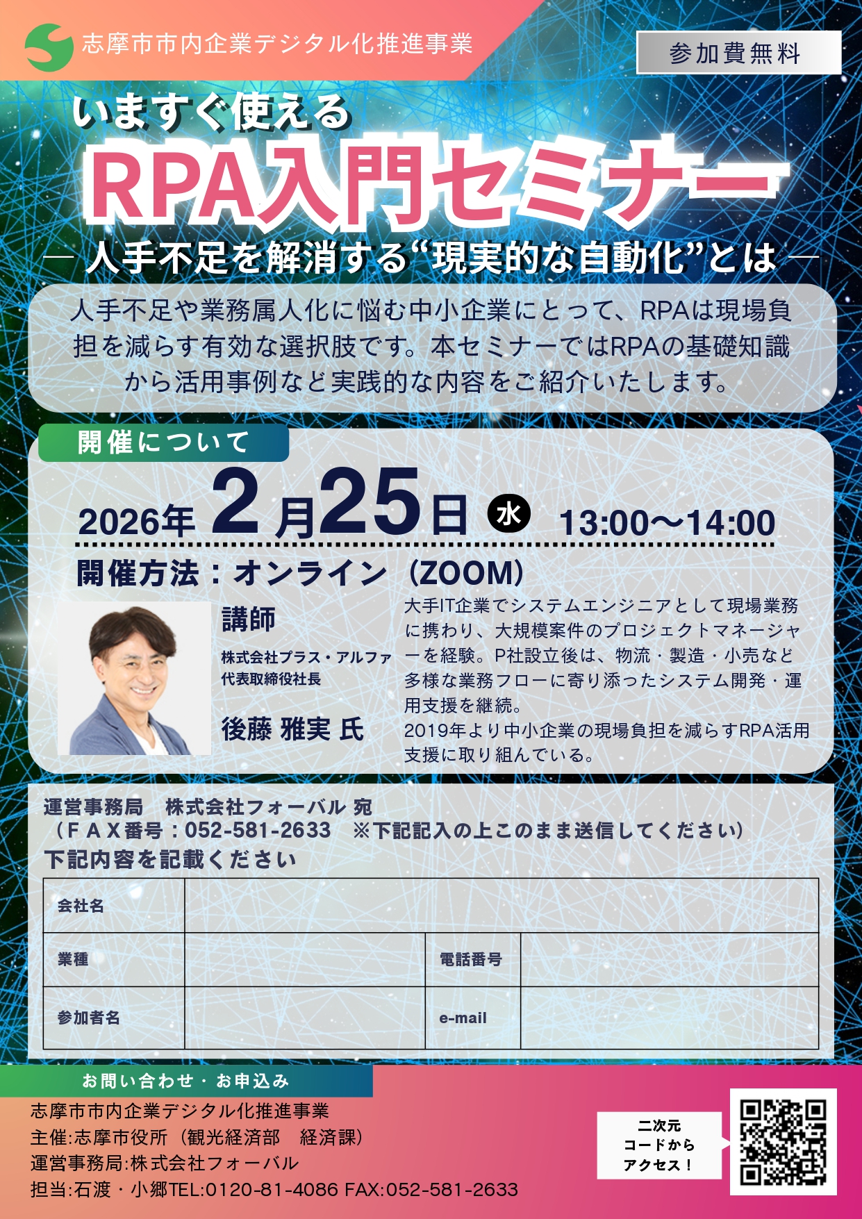 参加方法:オンライン(ZOOMのURLを送付しますので、二次元コードまたはファックスでお申し込みください)