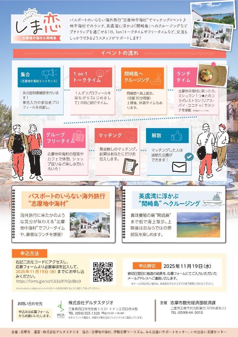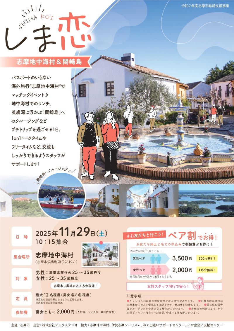 2025年11月29日(土曜日)に、志摩地中海村&間崎島にて、出会い応援イベント『しま恋』を開催します。