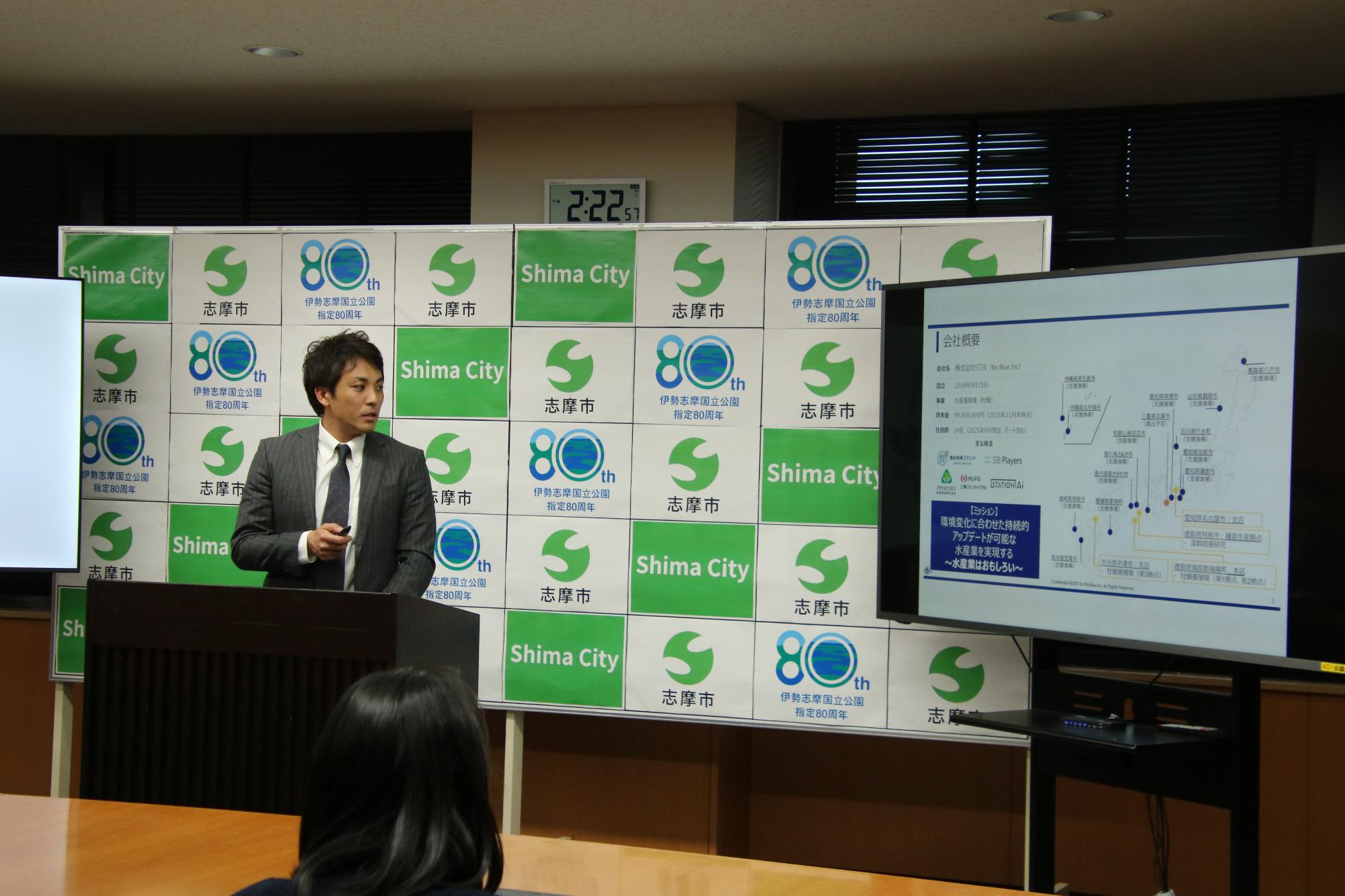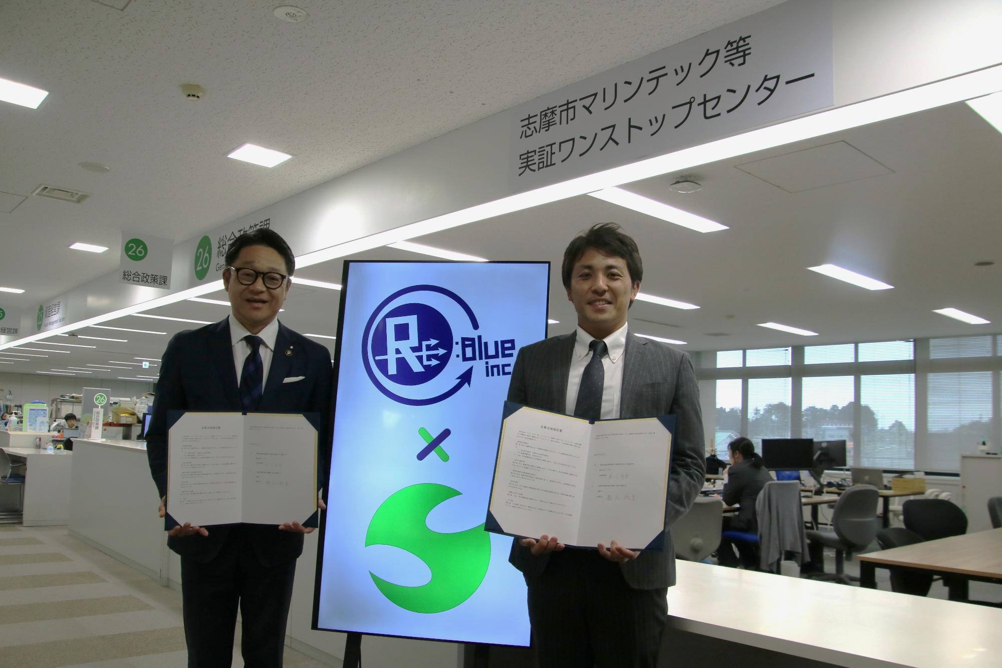 志摩市 橋爪市長、株式会社リブル 早川社長による協定書への署名により、マリンテック企業との初めてとなる連携協定を締結しました。
