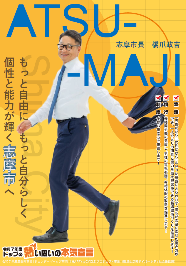 志摩市は、三重県が主導する「トップの熱い思いの本気宣言」に令和6年度から参画しています。この宣言は、性別による役割分担にとらわれず、誰もが家庭でも仕事でも活躍できる「令和モデル」の社会・職場環境づくりに向けて、「本気で取り組んでいる/これから取り組みたい」というトップの熱い思いをポスター風の「宣言書」にして「見える化」し、トップの思いを組織全体で共有することで、取組の一層の推進を目的としております。