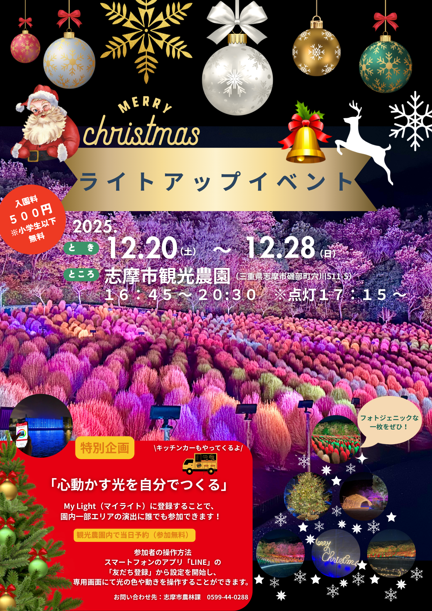 本施設は、国道167号沿いの道の駅「伊勢志摩」に隣接し、園内の丘に広がる約5,200本のコキアをはじめ、様々なスポットを光で幻想的に演出します。