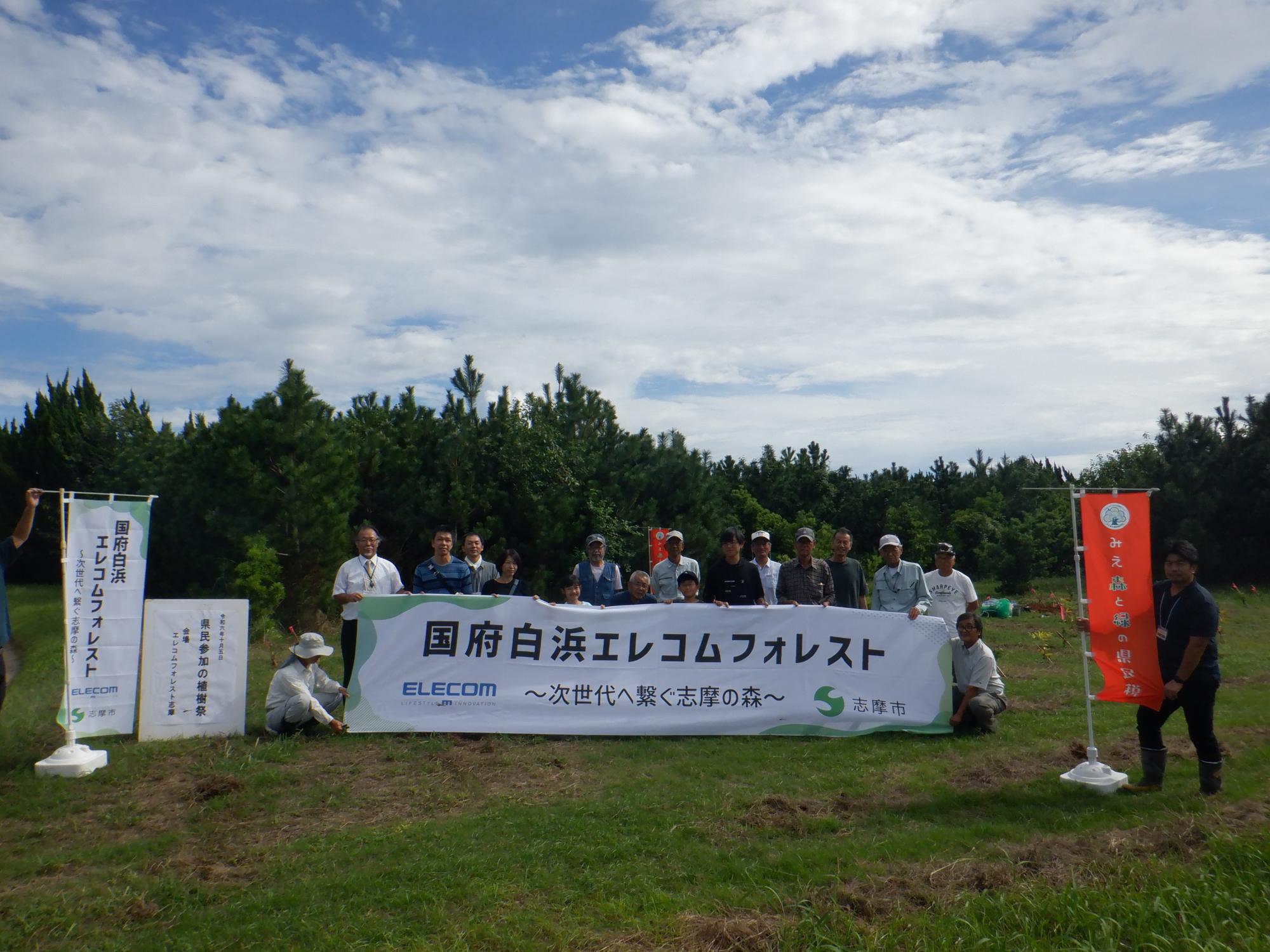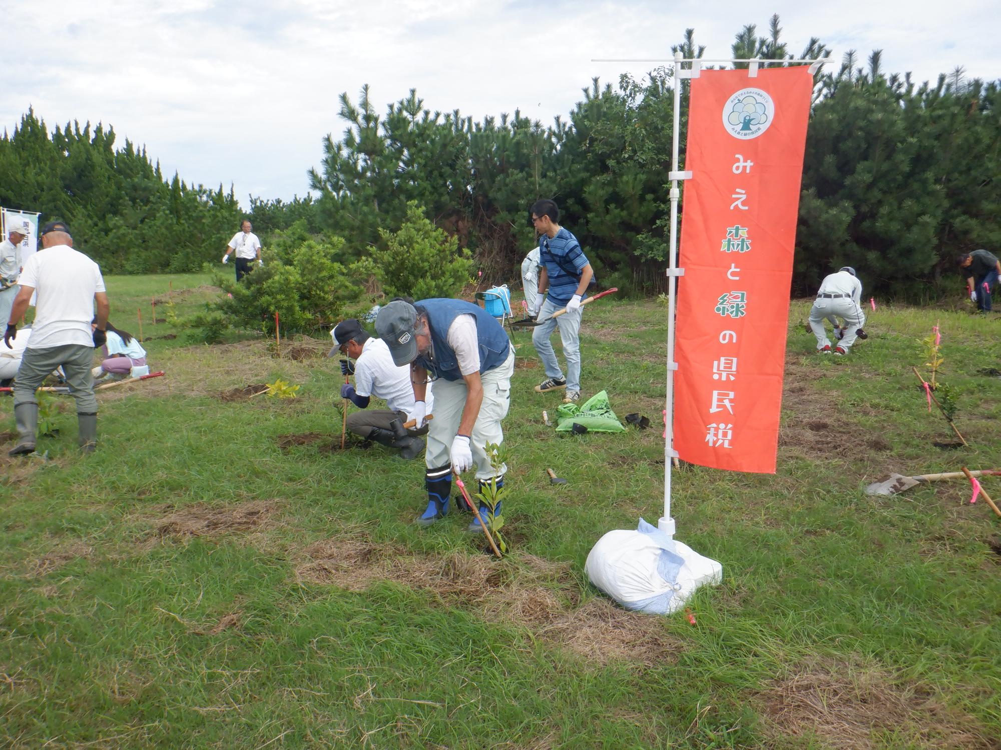 令和6年10月5日(土曜日)に阿児町国府のエレコムフォレスト志摩にて「県民参加の植樹祭」を開催しました。当日は参加者の方にウバメガシ、モチノキ、タブノキの苗木を植樹していただき、森林を身近に感じていただくとともに、講師から森林の持つ働きや重要性について学んでいただきました。