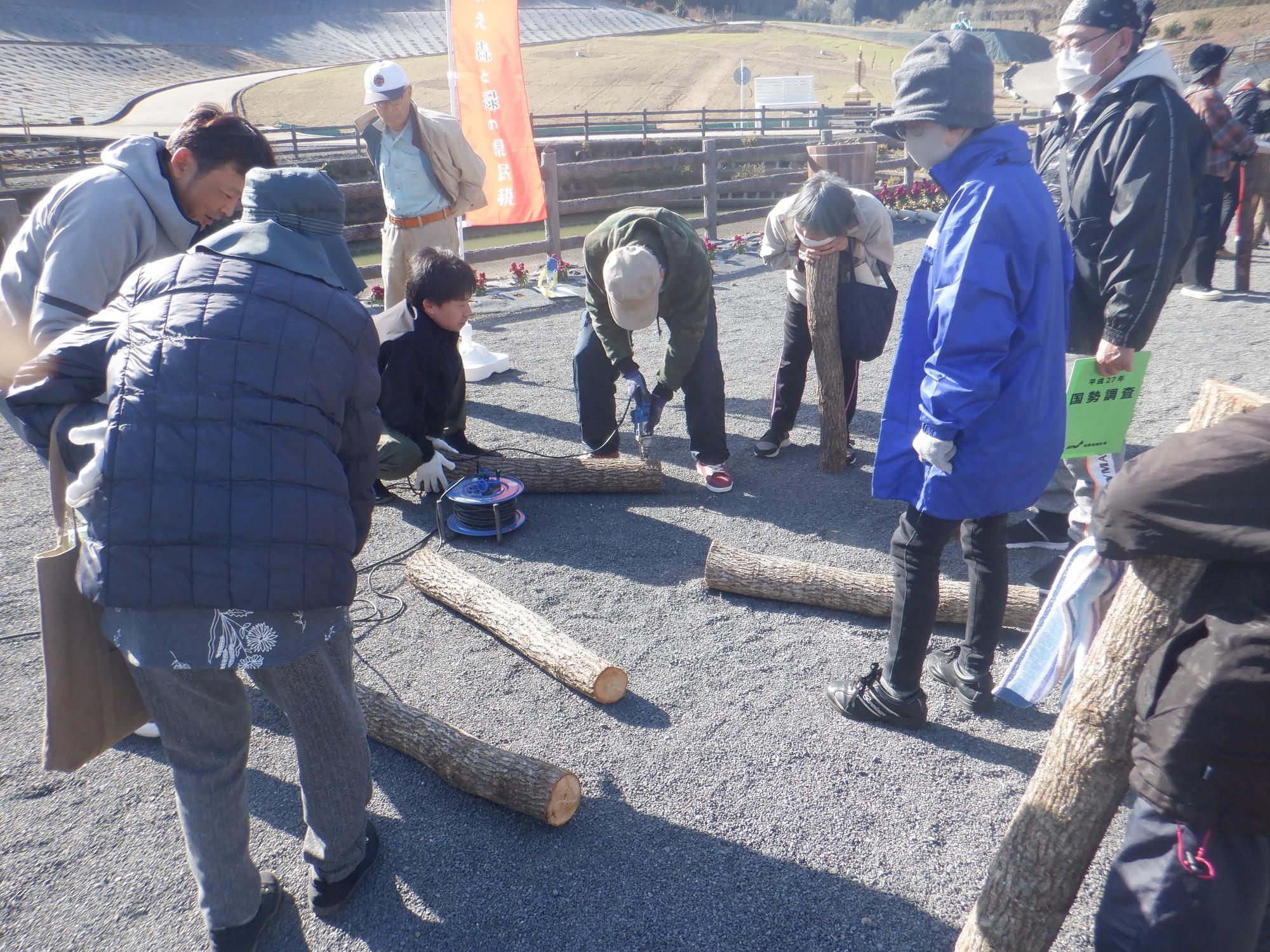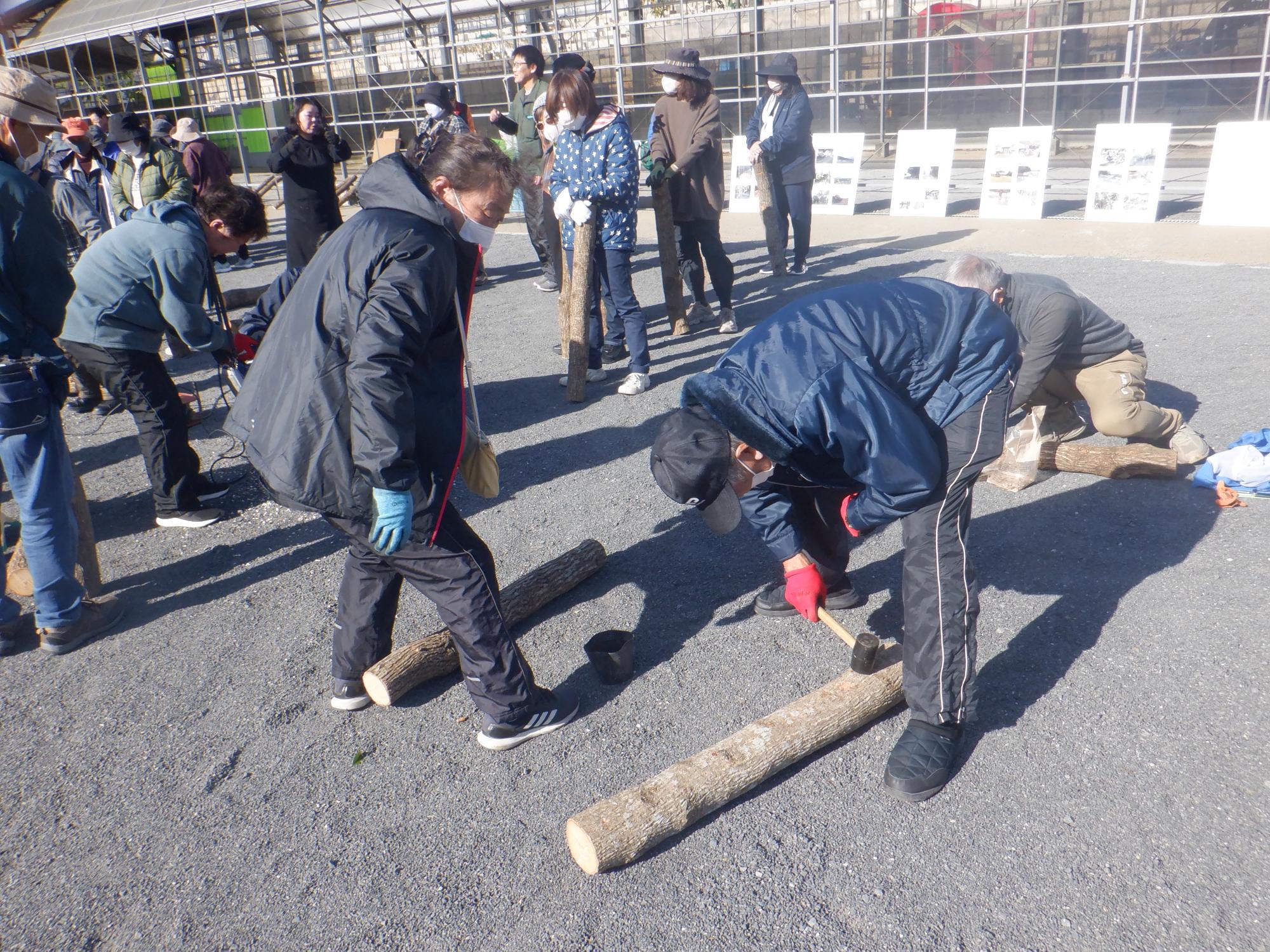 体験会では、いせしま森林組合の職員から、シイタケの原木栽培の仕組みや森林資源を有効に使うことの大切さについて説明を受けました。その後参加者の皆さんはコナラの原木にドリルで穴を空け、空いた穴にシイタケの駒菌をハンマーで打ち込む作業を行いました。参加者の方は、シイタケが大きく順調に成長するよう願いながら、作業に取り組まれていました。